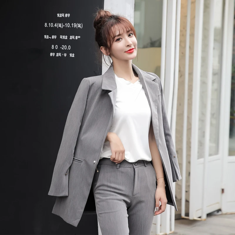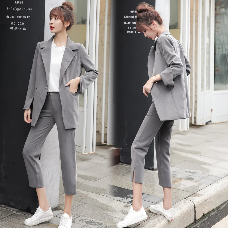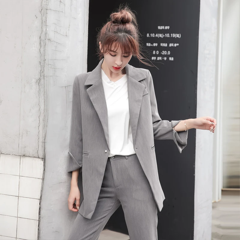 | Womens Two-Piece Set Korean Casual Elegant Grey Pearl Button Blzaer +ankle-length Trousers Female Office Wear 2020 Spring New |